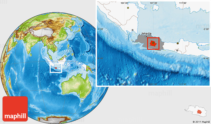 Maphill is a collection of map images. This image combines a physical map with the globe centered on Kab. Bandung. Use the buttons under the image to switch to different map types.