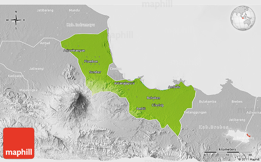 Physical map illustrates the mountains, lowlands, oceans, lakes and rivers and other physical landscape features of Kab. Cirebon. Differences in land elevations relative to the sea level are represented by color.