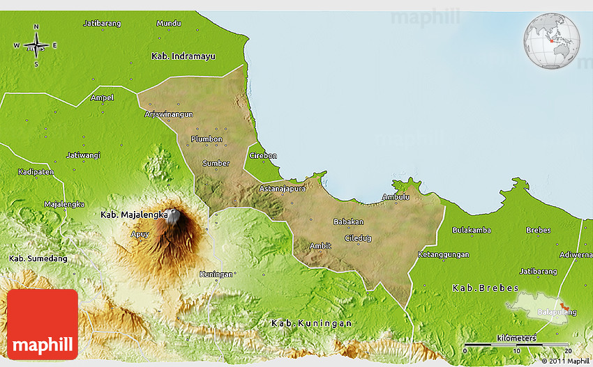 Physical map illustrates the mountains, lowlands, oceans, lakes and rivers and other physical landscape features of Kab. Cirebon. Differences in land elevations relative to the sea level are represented by color.