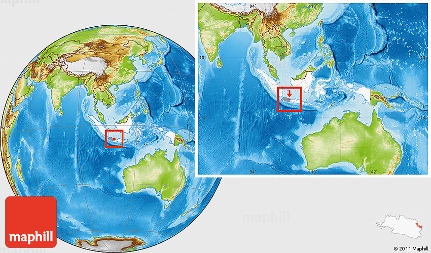 Maphill is a collection of map images. This image combines a physical map with the globe centered on Kab. Cirebon. Use the buttons under the image to switch to different map types.