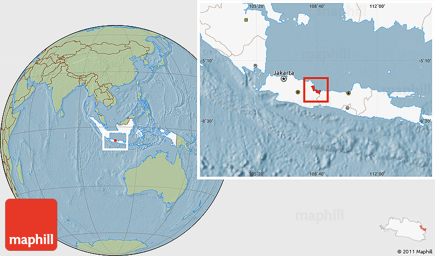 The location map of Kab. Cirebon combines two projections: the orthographic azimuthal projection for the globe and the simple geographic projection for the rectangular part of the map. Geographic projection has straight meridians and parallels, each degree of latitude and longitude is the same size over the entire world map.