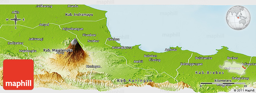 Physical map illustrates the mountains, lowlands, oceans, lakes and rivers and other physical landscape features of Kab. Cirebon. Differences in land elevations relative to the sea level are represented by color.