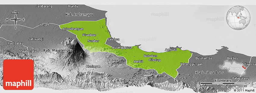 The panoramic physical map represents one of several map types and styles available. Look at Kab. Cirebon, West Java, Indonesia from different perspectives.
