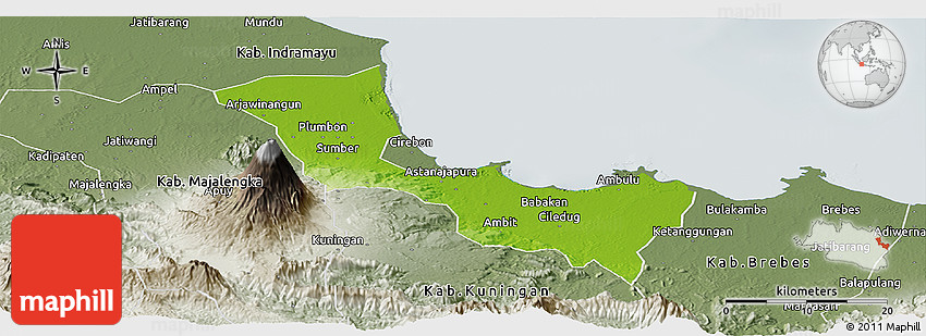 The panoramic physical map represents one of several map types and styles available. Look at Kab. Cirebon, West Java, Indonesia from different perspectives.
