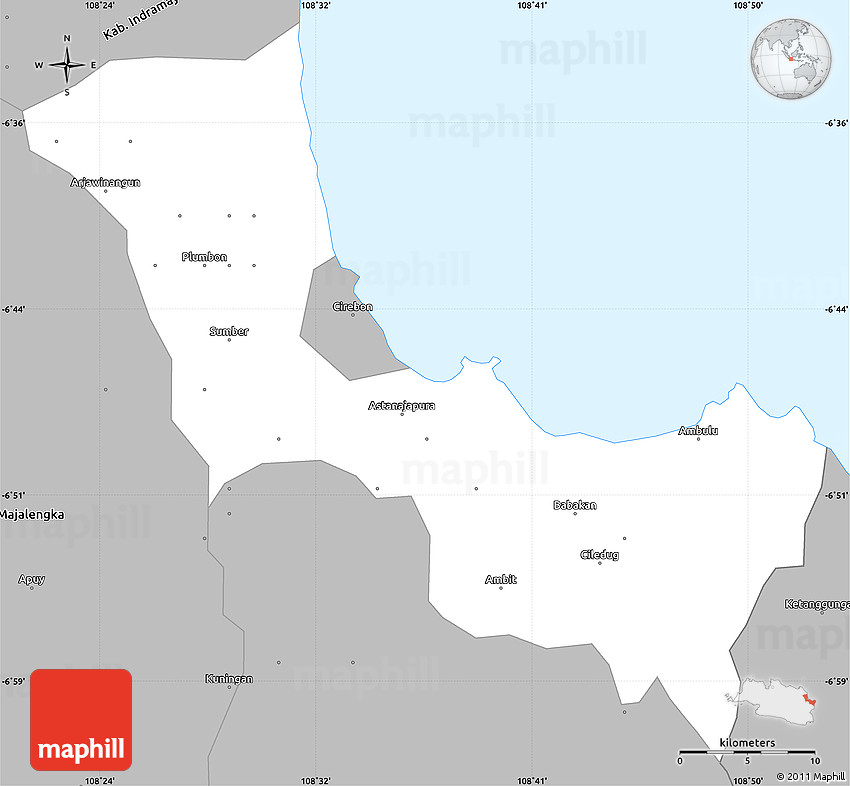The simple gray outline map represents one of several map types and styles available. Look at Kab. Cirebon, West Java, Indonesia from different perspectives.