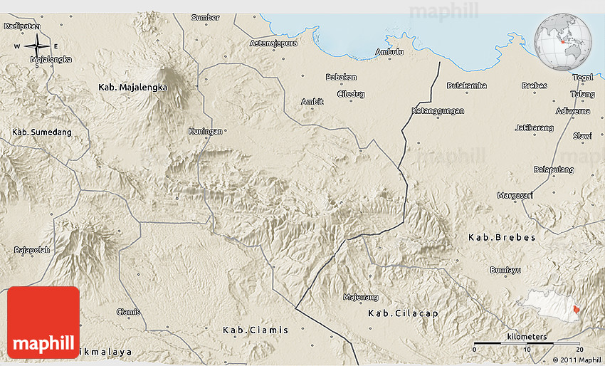 Shaded relief map shows landscape features, such as mountains, valleys and plateaus. Flat areas are smooth on the map, areas with steep slopes and mountains appear more rough. The above map of Kab. Kuningan was created using a digital elevation model.