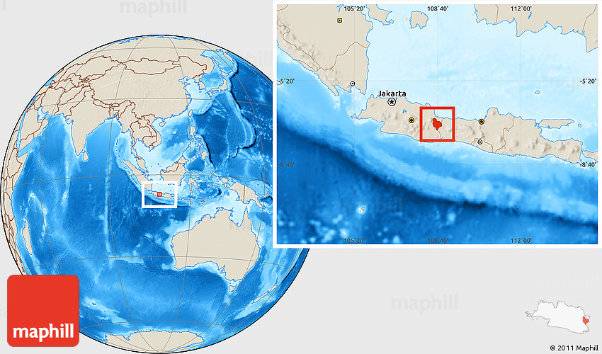 Maphill is a collection of map images. This image combines a shaded relief map with the globe centered on Kab. Kuningan. Use the buttons under the image to switch to different map types.