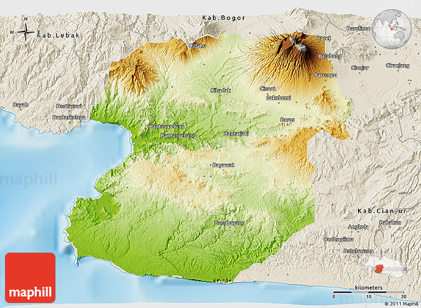 Physical map illustrates the mountains, lowlands, oceans, lakes and rivers and other physical landscape features of Kab. Sukabumi. Differences in land elevations relative to the sea level are represented by color.
