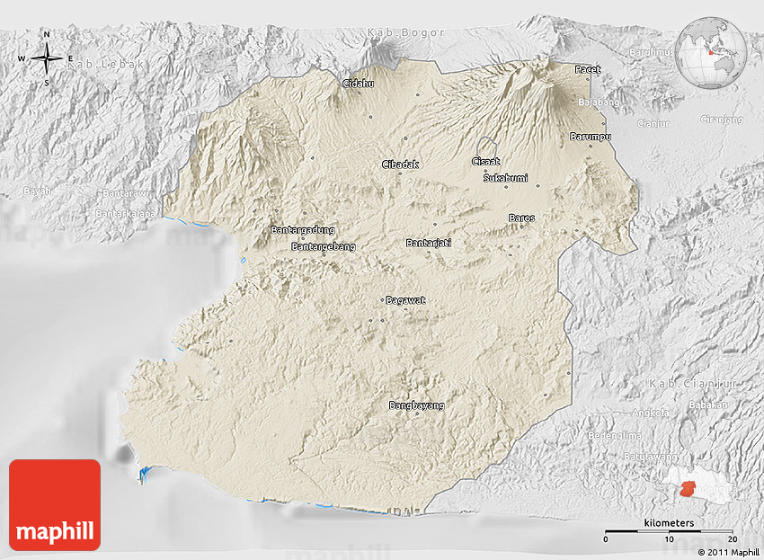 Shaded relief map shows landscape features, such as mountains, valleys and plateaus. Flat areas are smooth on the map, areas with steep slopes and mountains appear more rough. The above map of Kab. Sukabumi was created using a digital elevation model.