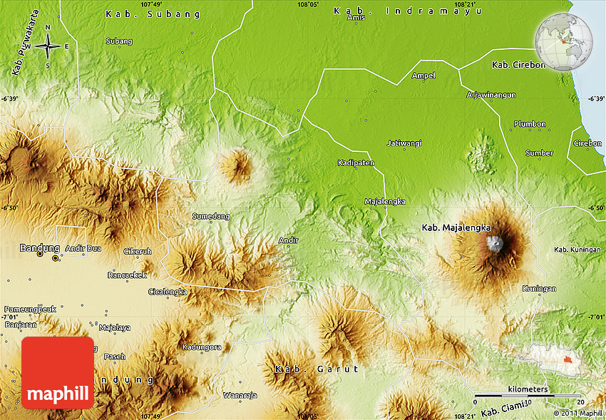 Physical map illustrates the mountains, lowlands, oceans, lakes and rivers and other physical landscape features of Kab. Sumedang. Differences in land elevations relative to the sea level are represented by color.