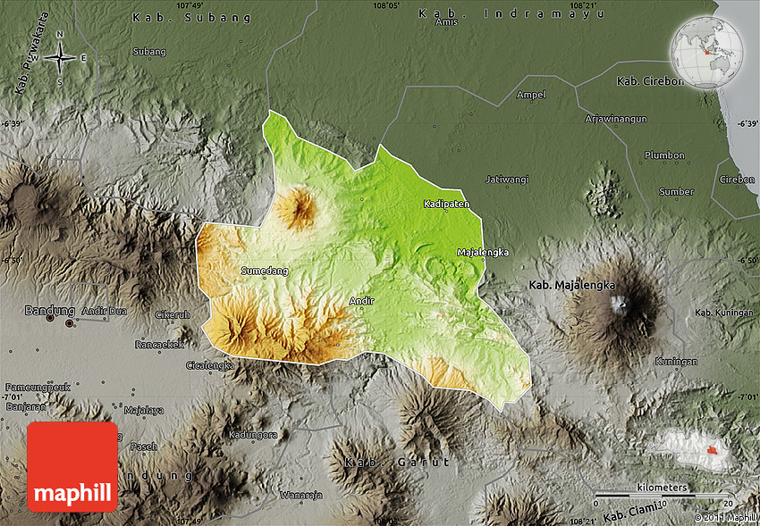 The flat physical map represents one of several map types and styles available. Look at Kab. Sumedang, West Java, Indonesia from different perspectives.