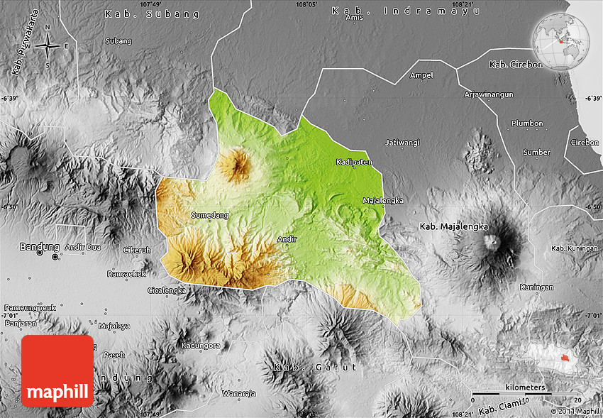 The flat physical map represents one of several map types and styles available. Look at Kab. Sumedang, West Java, Indonesia from different perspectives.