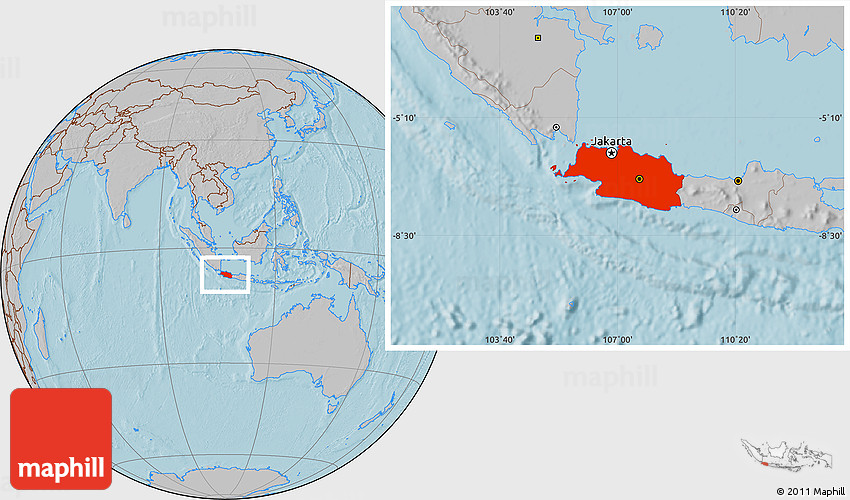 Maphill is a collection of map images. This image combines a gray map with the globe centered on West Java. Use the buttons under the image to switch to different map types.
