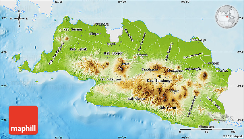 Physical map illustrates the mountains, lowlands, oceans, lakes and rivers and other physical landscape features of West Java. Differences in land elevations relative to the sea level are represented by color.