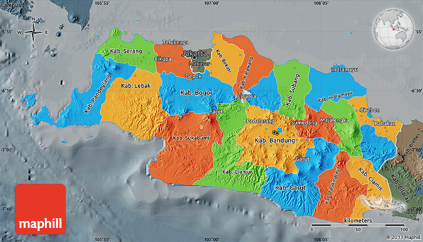 The flat political map represents one of many map types and styles available. Look at West Java from different perspectives.