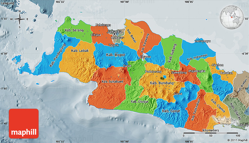 The flat political map represents one of many map types and styles available. Look at West Java from different perspectives.