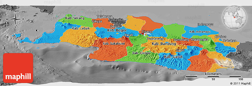 The panoramic political map represents one of many map types and styles available. Look at West Java from different perspectives.