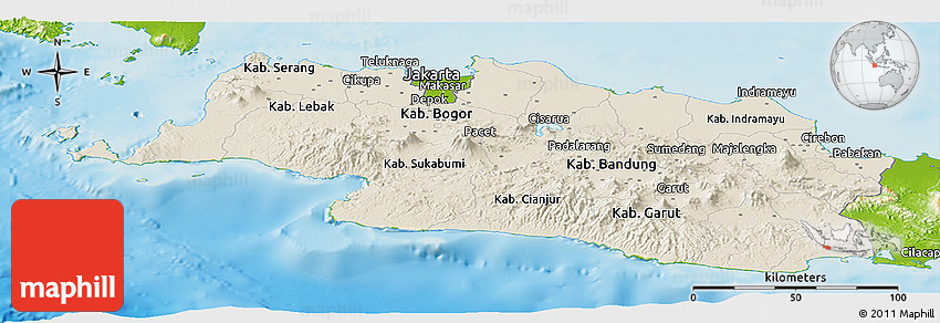 Physical map illustrates the mountains, lowlands, oceans, lakes and rivers and other physical landscape features of West Java. Differences in land elevations relative to the sea level are represented by color.