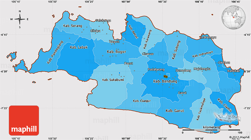 Political shades map is similar to a political map, however different regions are represented by the tints and shades of the same color, not by different colors. The purpose of a political map of West Java is to provide information about how people have divided up the world into countries and administrative regions.