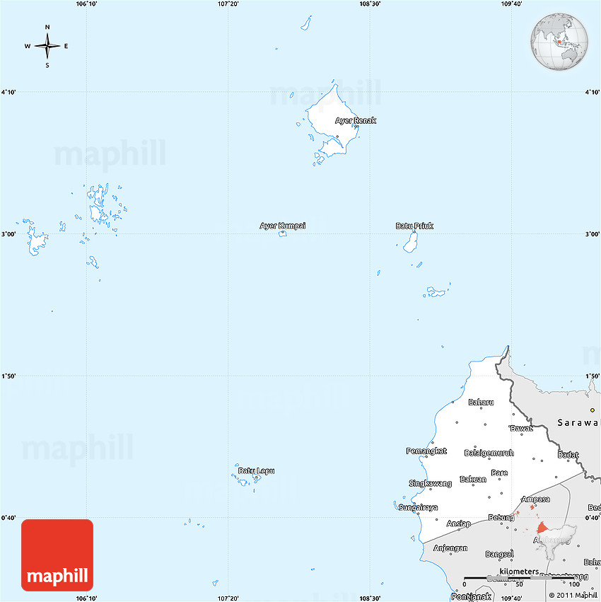 The simple silver style outline map represents one of several map types and styles available. Look at Kab. Sambas, West Kalimantan, Indonesia from different perspectives.
