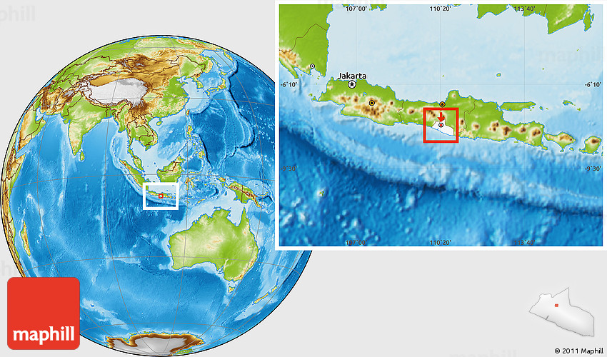 Maphill is a collection of map images. This image combines a physical map with the globe centered on Kodya. Yogyakarta. Use the buttons under the image to switch to different map types.