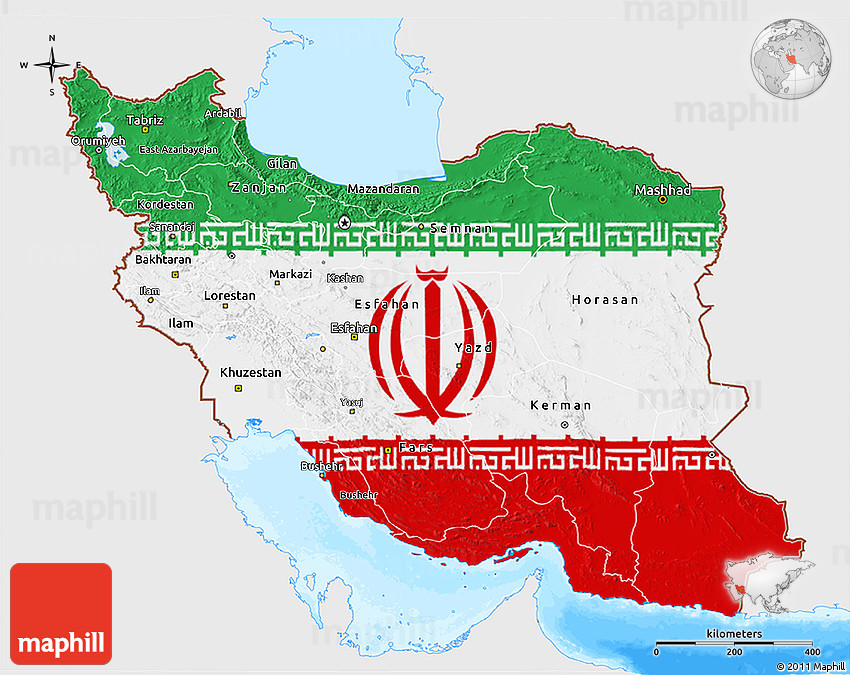 Flag map shows the flag of Iran clipped inside the country's borders. Flag image is resized to match the width and height of the country's outline. Maphill flag maps are more precise than often used flag clip art illustrations.