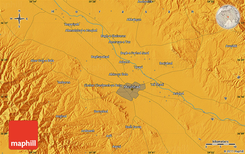 The value of Maphill lies in the possibility to look at the same area from several perspectives. Maphill presents the map of Mashhad in a wide variety of map types and styles.