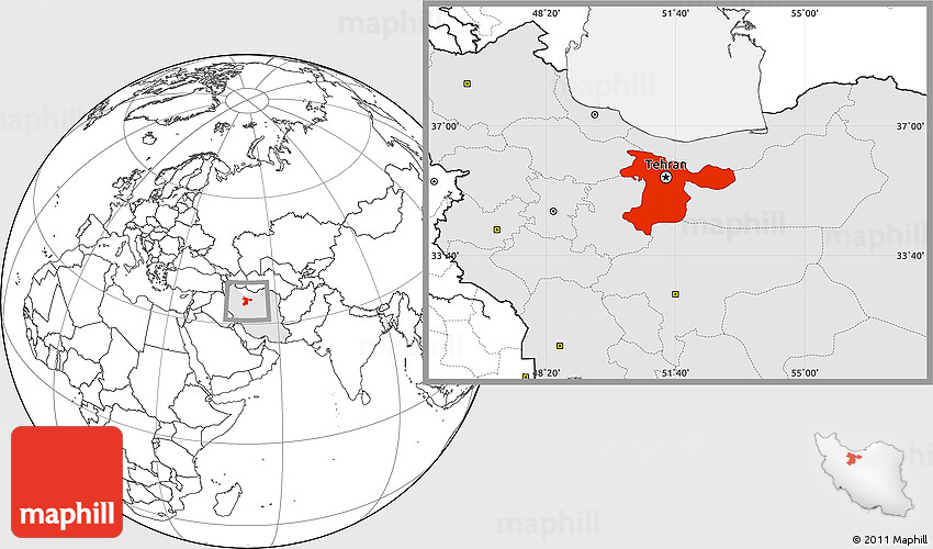 Maphill is a collection of map images. This image combines a blank map with the globe centered on Tehran. Use the buttons under the image to switch to different map types.
