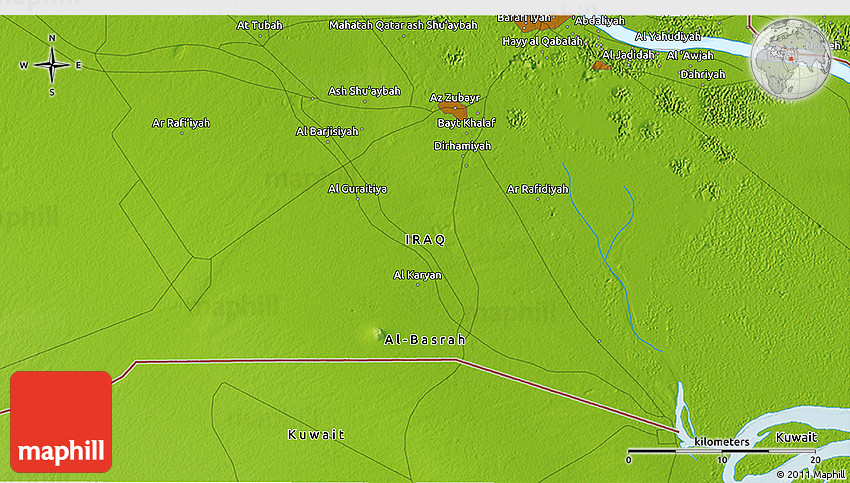 The 3D physical map represents one of many map types and styles available. Look at Kūt al Muftī, Al-Basrah, Iraq from different perspectives.