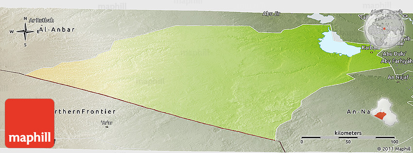 Physical map illustrates the mountains, lowlands, oceans, lakes and rivers and other physical landscape features of Karbala. Differences in land elevations relative to the sea level are represented by color.