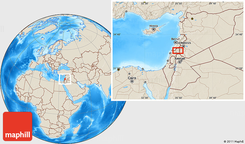 Maphill is a collection of map images. This image combines a shaded relief map with the globe centered on Peqi`in H̱adasha. Use the buttons under the image to switch to different map types.