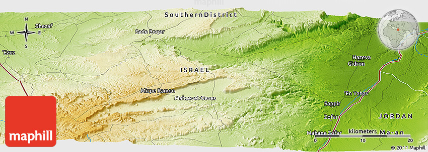 The panoramic physical map represents one of many map types and styles available. Look at Makhfar al Ghamr, Southern District, Israel from different perspectives.