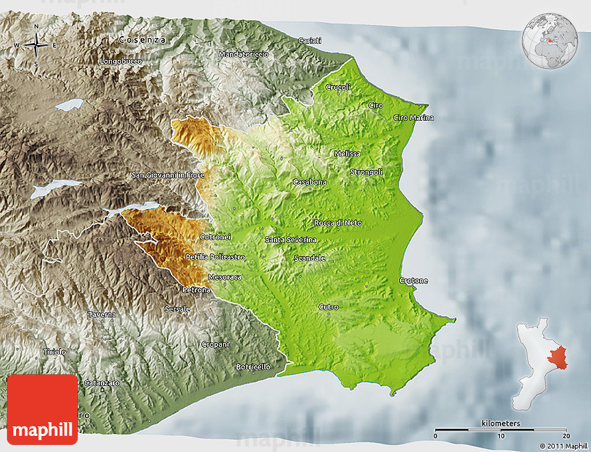 Physical map illustrates the mountains, lowlands, oceans, lakes and rivers and other physical landscape features of Crotone. Differences in land elevations relative to the sea level are represented by color.