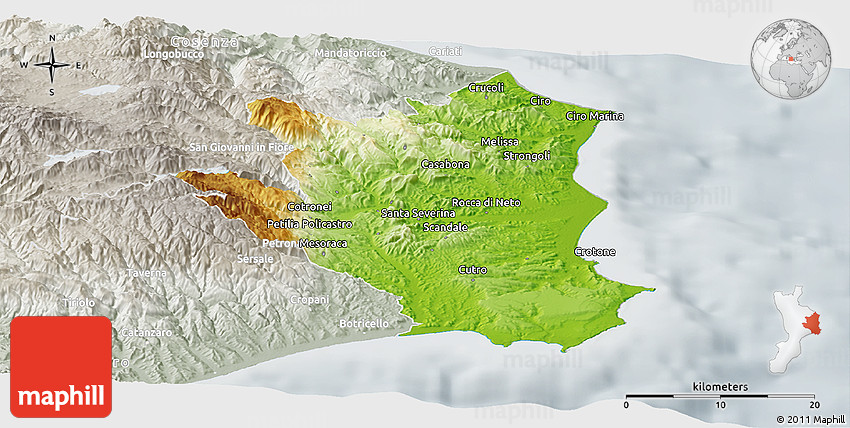The panoramic physical map represents one of several map types and styles available. Look at Crotone, Calabria, Italy from different perspectives.