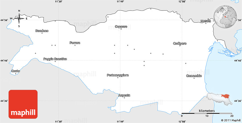 The simple silver style outline map represents one of several map types and styles available. Look at Ferrara, Emilia-Romagna, Italy from different perspectives.