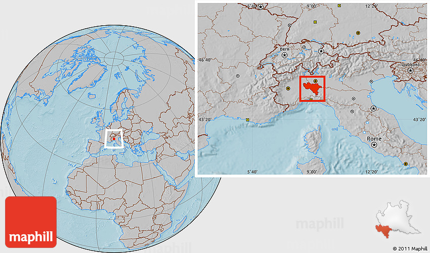 Maphill is a collection of map images. This image combines a gray map with the globe centered on Pavia. Use the buttons under the image to switch to different map types.