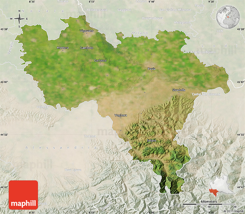 Each map type offers different information and each map style is designed for a different purpose. Read about the styles and map projection used in the above map (Satellite Map of Pavia, lighten).