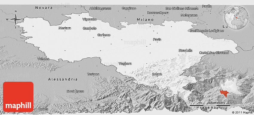 The panoramic gray map represents one of several map types and styles available. Look at Pavia, Lombardia, Italy from different perspectives.