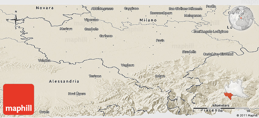 The panoramic shaded relief map represents one of several map types and styles available. Look at Pavia, Lombardia, Italy from different perspectives.