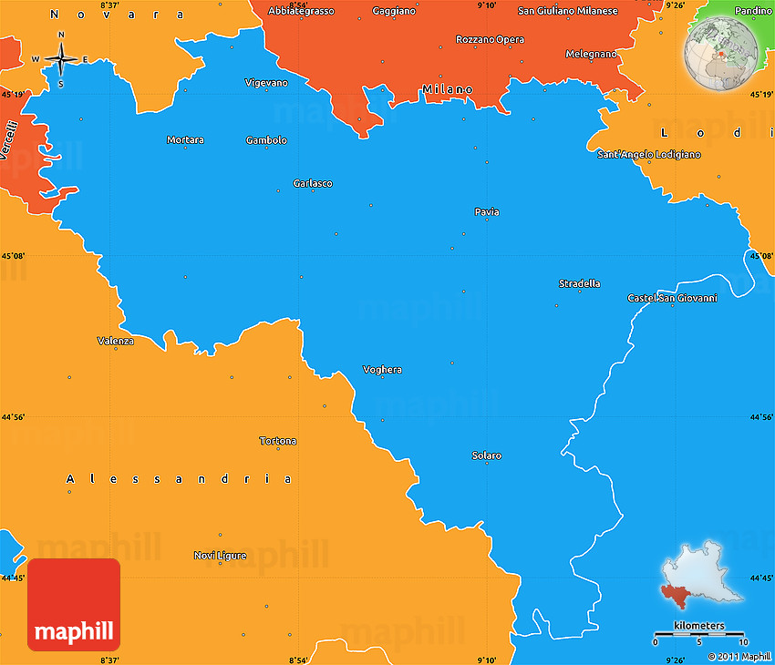 Each map type offers different information and each map style is designed for a different purpose. Read about the styles and map projection used in the above map (Political Simple Map of Pavia).