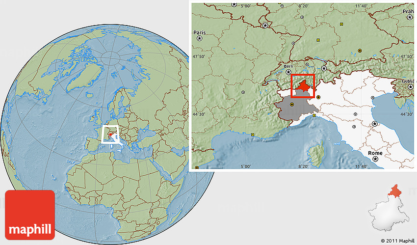The location map of Verbano-Cusio-Ossola combines two projections: the orthographic azimuthal projection for the globe and the simple geographic projection for the rectangular part of the map. Geographic projection has straight meridians and parallels, each degree of latitude and longitude is the same size over the entire world map.