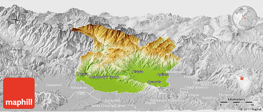 The panoramic physical map represents one of several map types and styles available. Look at Pistoia, Toscana, Italy from different perspectives.