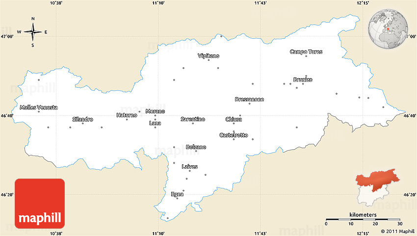 The simple classic style outline map represents one of several map types and styles available. Look at Bolzano, Trentino-Alto Adige, Italy from different perspectives.