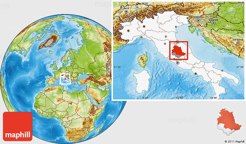 Maphill is a collection of map images. This image combines a physical map with the globe centered on Perugia. Use the buttons under the image to switch to different map types.