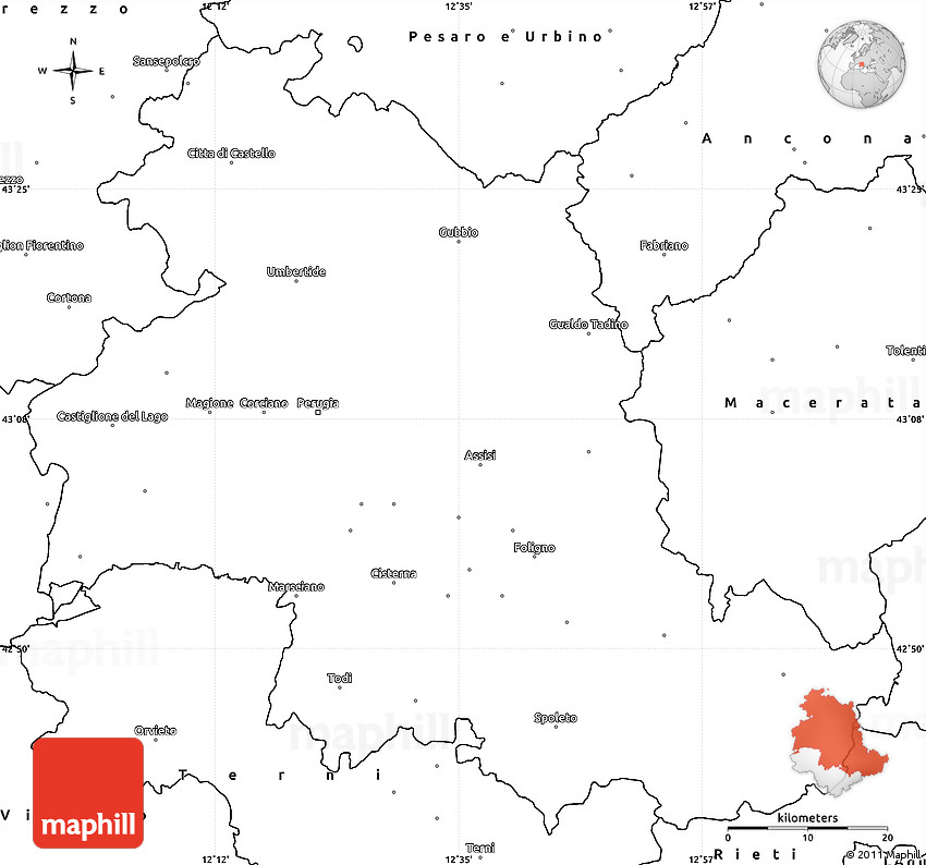 The simple blank outline map represents one of several map types and styles available. Look at Perugia, Umbria, Italy from different perspectives.