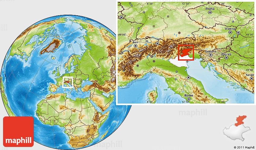 Maphill is a collection of map images. This image combines a physical map with the globe centered on Belluno. Use the buttons under the image to switch to different map types.