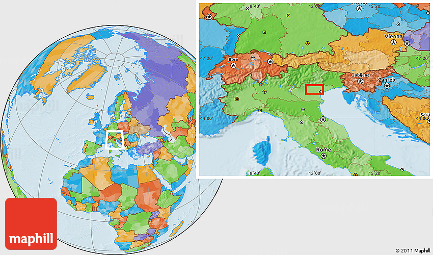Maphill is a collection of map images. This image combines a political map with the globe centered on Levada di Sotto. Use the buttons under the image to switch to different map types.