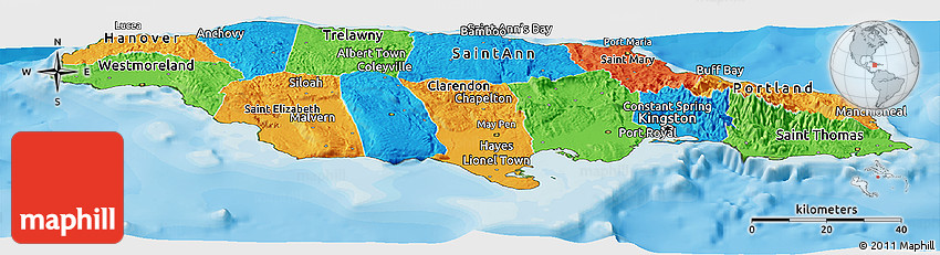 The panoramic political map represents one of many map types and styles available. Look at Jamaica from different perspectives.
