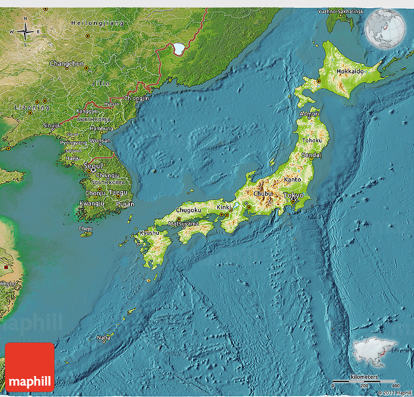 Physical map illustrates the mountains, lowlands, oceans, lakes and rivers and other physical landscape features of Japan. Differences in land elevations relative to the sea level are represented by color.
