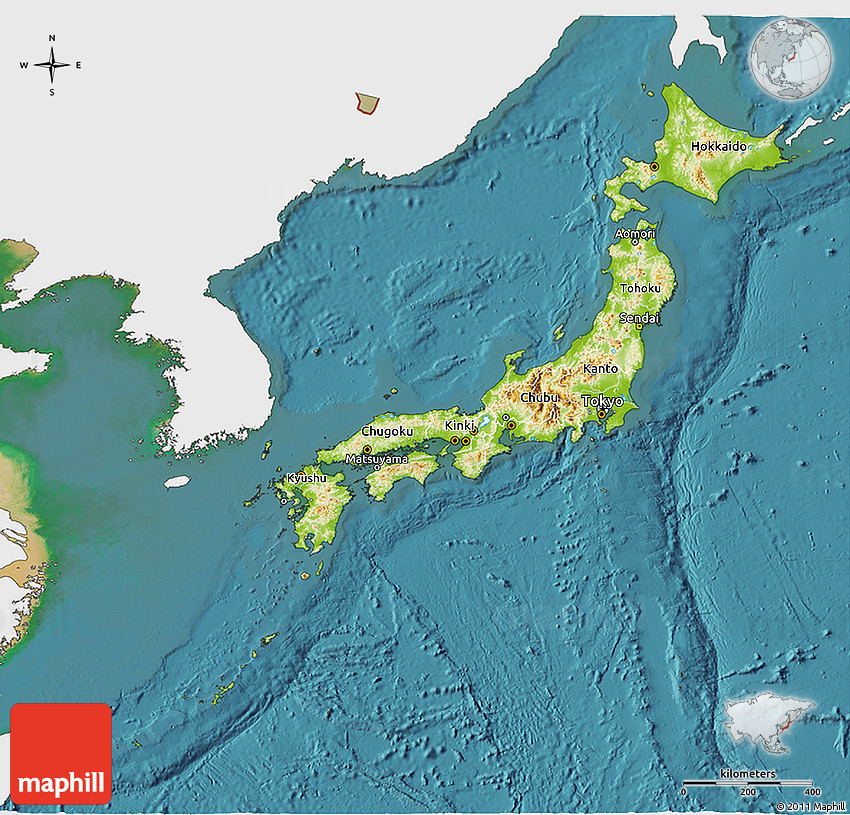 Physical map illustrates the mountains, lowlands, oceans, lakes and rivers and other physical landscape features of Japan. Differences in land elevations relative to the sea level are represented by color.